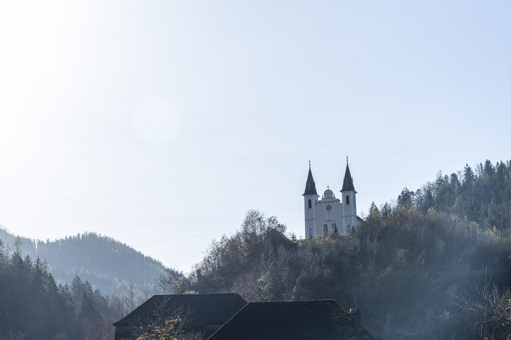An einer Gabelung verließen wir den Kleinen Ybbstalradweg und fuhren nach Maria Seesal, einem Wallfahrtsort mit einem Kirchlein am Berg. Kurz nach Maria Seesal verließen wir die Asphaltstraße und bogen in einen Wanderweg ab, der stetig und zuletzt sogar steil durch einen Laubwald führte. Er mündete auf einer Weide und letztlich auf einer Bergkuppe, auf der es auf der anderen Seite nach Lunz am See hinunterging.