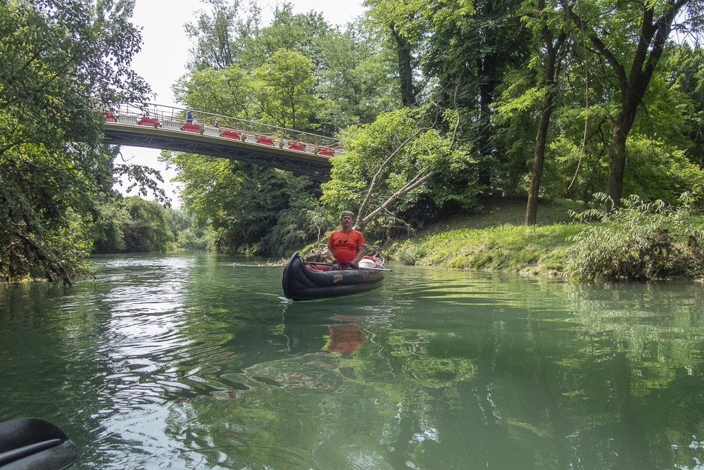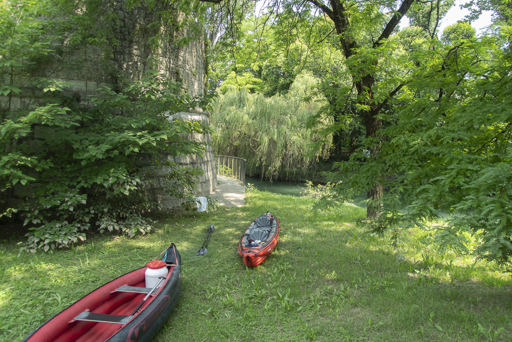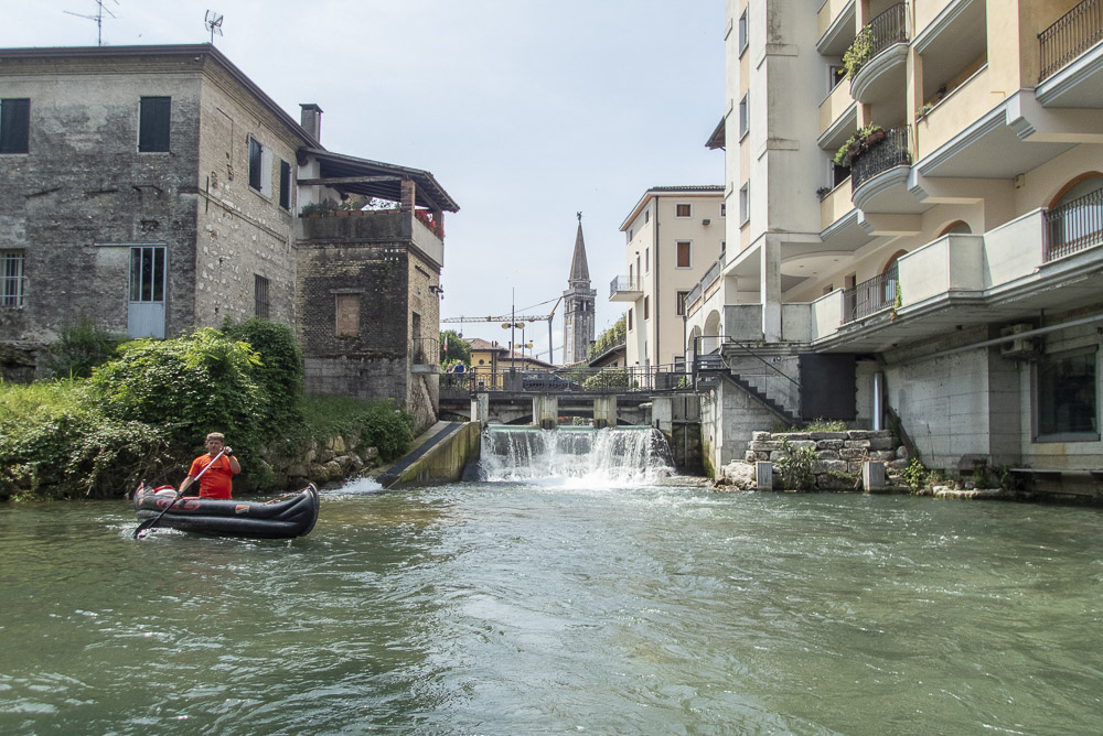 Wir parkten in Sacile in der Nähe des Castel Vecchio und pumpten unser Gumotex-Kajak* im Park beim Turm des Castel Vecchio auf. Einige Leute schauten etwas verwundert, als wir unsere Dry-Bags* ins Boot luden, aber im Grund störte es niemand. Der örtliche Kanuverein ist nicht weit entfernt und man ist den Anblick von Booten offensichtlich gewohnt. Alfons Zaunhubers Buch hatte uns eigentlich empfohlen, beim Kanuverein einzusetzen, aber dort bot sich keine Parkmöglichkeit an. Also mussten das ehrwürdige Castel und dessen Parkanlage als Einsetzstelle herhalten.