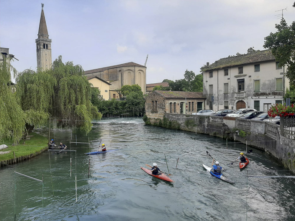 Zunächst paddelten wir ein Stück flussaufwärts bis zur Brücke der alten Mühle. Dort kann man mit dem Kajak vor der Kirche posieren – ein ungewöhnliches Fotomotiv! Ein ebenso ungewöhnliches Schauspiel ist es, wenn die Vereinskajaks an der Slalomstrecke trainieren. Dies konnte Axel, der nach der Bootstour noch einmal nach Sacile zurückgekehrt ist, fotografisch festhalten.