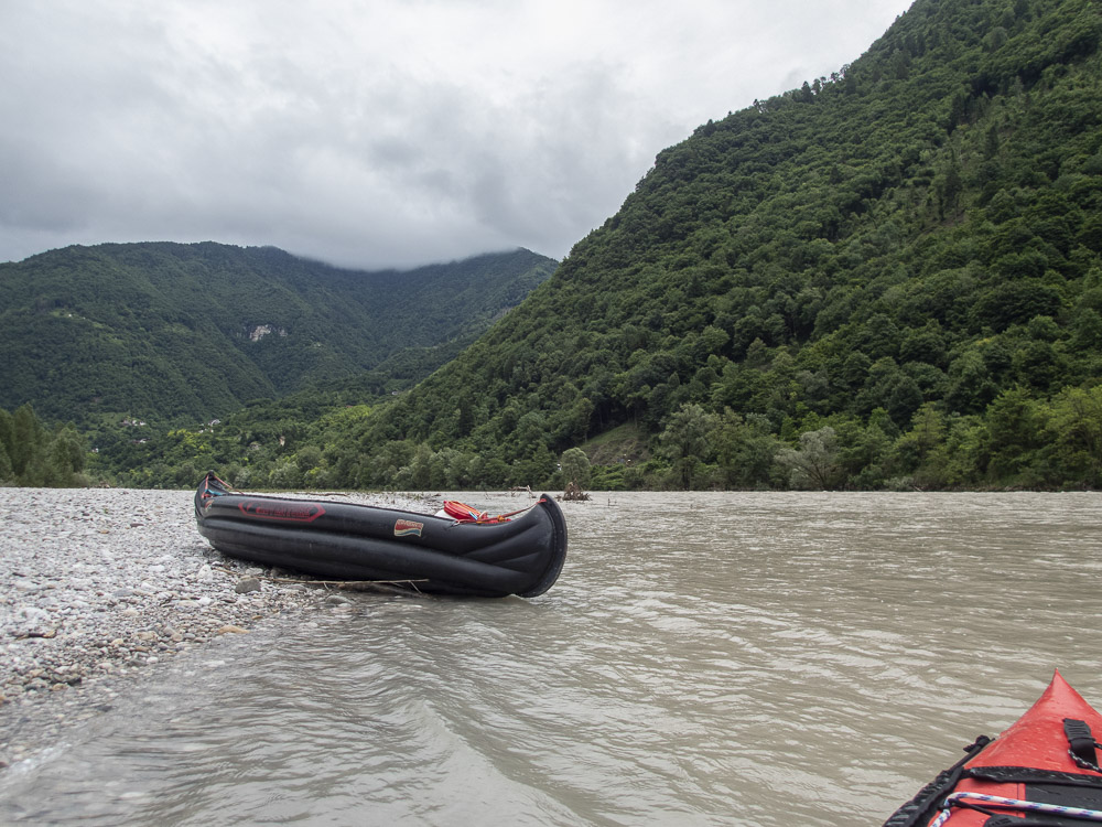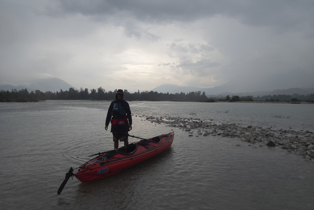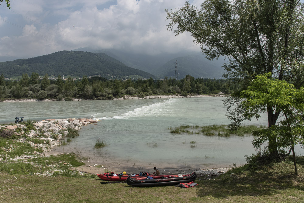 Auf einer der zahlreichen Schotterbänke inmitten des verzweigten Flusslaufes legten wir eine Pause ein. Unsere Freude über den sonnigen Tag war nur von kurzer Dauer. Dunkle Wolken schoben sich über die Berge in Richtung Fluss. Innerhalb kurzer Zeit wurde es deutlich kühler und ziemlich dunkel. Es war klar, dass wir dem Regen nicht entrinnen können würden, daher zogen wir Neoprenanzug*, bzw. –jacke* und –mantel* an. Wir fuhren den Wolken entgegen und sozusagen gegen die Windrichtung unter ihnen durch. Als wir in Busche bei der Ausstiegsstelle, dem Lago di Busche vor dem Wehr, ankamen, schien die Sonne wieder vom Himmel.