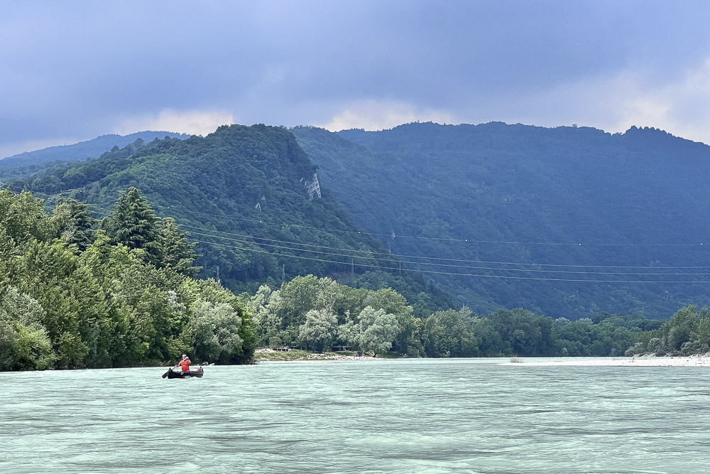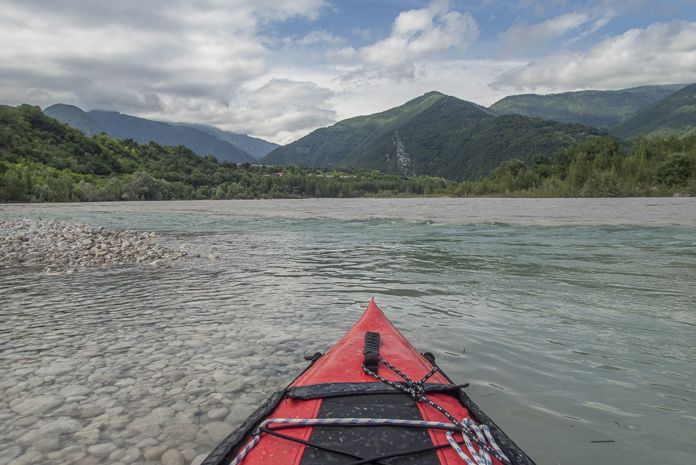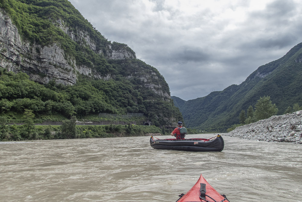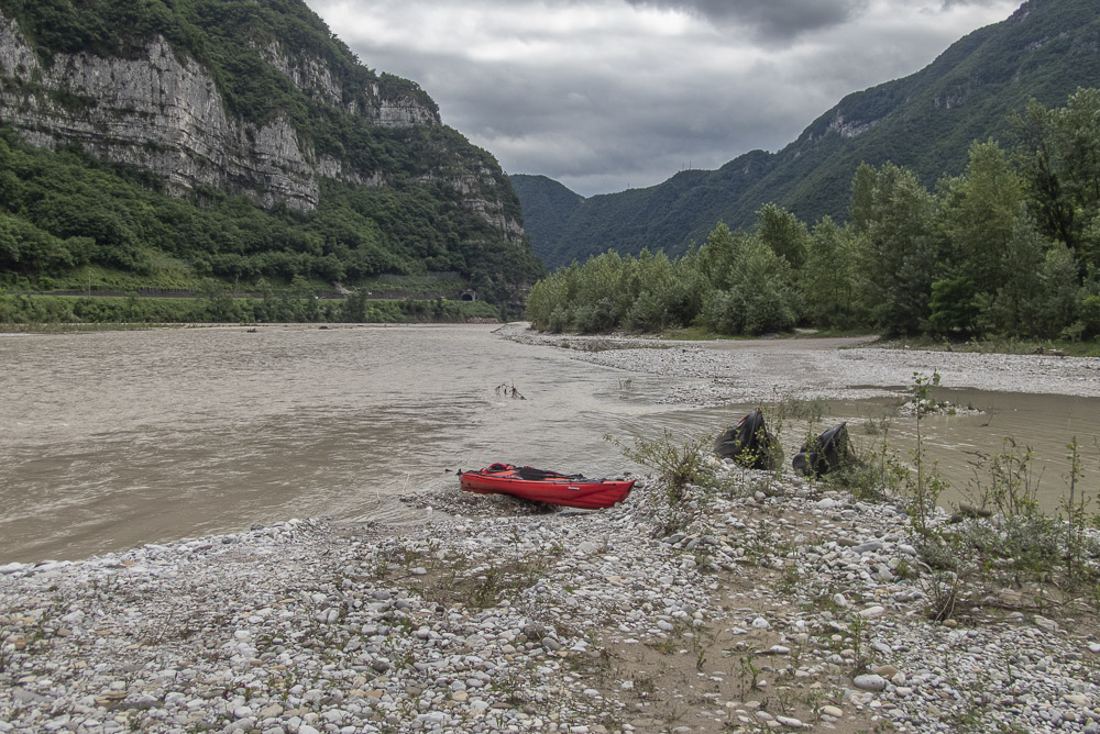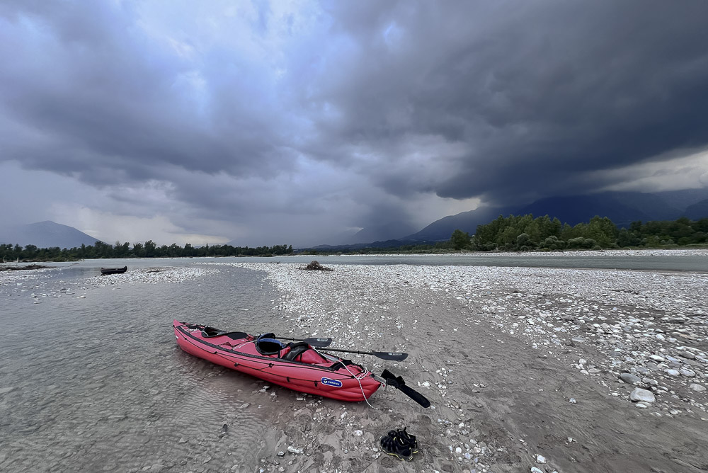 Nachdem uns dieser Urlaub bereits zwei herrliche Paddeletappen am Tagliamento beschert hatte, waren wir gespannt, ob der nächste Fluss, den wir ansteuern wollten, uns ebenfalls derart epische Eindrücke bieten würde. Und der Piave enttäuschte uns nicht! Auf drei Etappen haben wir mehrere Seiten des Flusses kennengelernt: Stromschnellen bei Hochwasser, die uns zügig an Steilwänden vorbei trugen, türkise Flussarme im weit verzweigten Schotterbett und als Zugabe noch ein Unwetter.