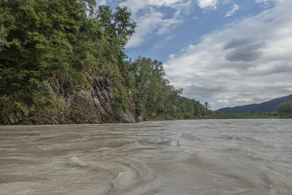 Der Pegel war auf 149 m gesunken, was nicht mehr Hochwasser, sondern Mittelwasser entsprach. Die Sedimente waren noch nicht gänzlich abgesunken, daher hatte der Fluss seine türkise Farbe noch immer nicht zurückbekommen. Trotzdem wirkte die Szenerie im vieles freundlicher als drei Tage zuvor. Obwohl nördlich der letzten Etappe, also dem Alpenhauptkamm näher gelegen, waren die Flussufer diesmal nicht von Steilhängen gesäumt, die Berge bzw. Hügel befanden sich in einiger Entfernung des Flusses.