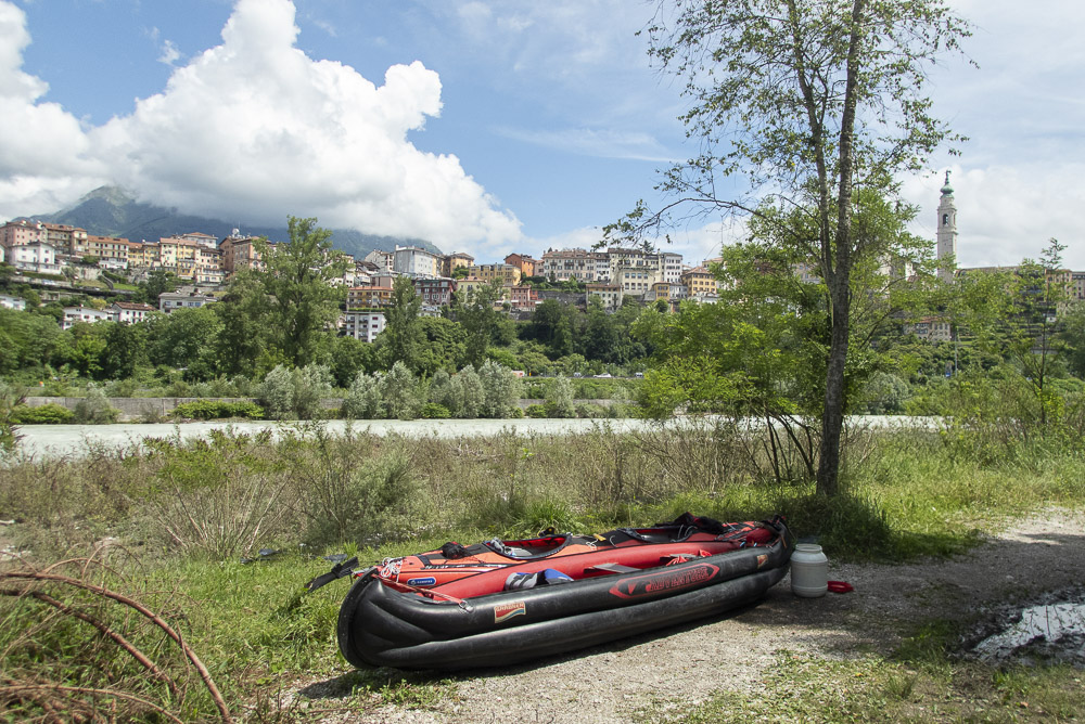 Nach zwei Pausetagen schien die Sonne endlich wieder und wir waren bereit für die nächste Etappe am Piave: circa 25 Kilometer von Belluno bis zum Wehr von Busche. Es war nicht leicht, in Belluno eine Einsetzstelle zu finden. Am Flussufer gegenüber dem Ortskern befanden sich Einfamilienhäuser mit Parkverbotsschildern davor. Wir bauten unsere Boote auf einem leeren Wiesengrundstück auf und parkten unseren Bus danach an der Ortseinfahrt auf einem großen gebührenpflichtigen Parkplatz (dort allerdings Wasserentsorgung und -versorgung möglich!). Den zweiten Bus hatten wir am Wehr von Busche zurückgelassen, am Parkplatz des Kiosks in der Nähe unseres Übernachtungsplatzes.