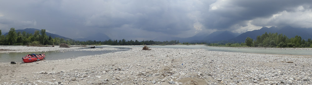 Auf dieser Etappe zeigte sich der Fluss von einer anderen Seite: die Berge hinter sich gelassen, floß er nunmehr durch eine weitgehend flache Landschaft. Wiesen, Auwälder, Buschwerk und kleine Städtchen säumten das breite Schotterbett, in dem die verzweigten, türkisen Arme sich ihren Weg suchten. Landschaftlich haben uns die anderen Etappen besser gefallen, trotzdem hat das Paddeln in diesem Labyrinth seinen Reiz.