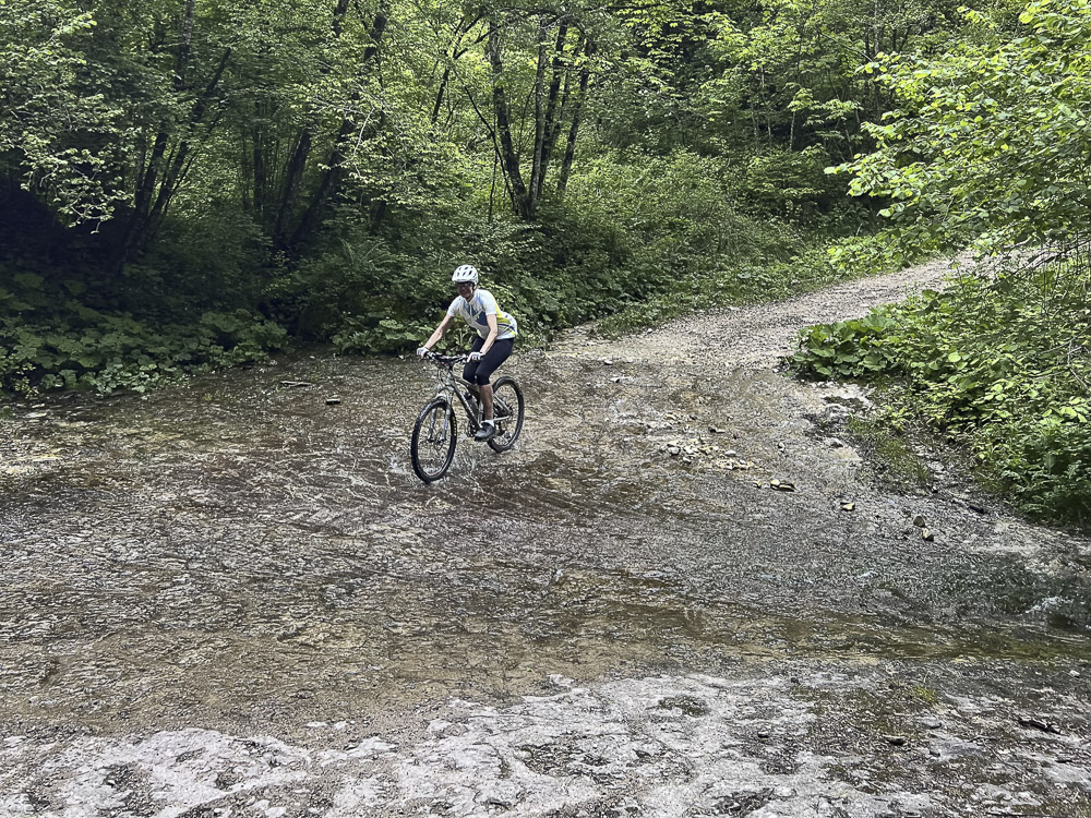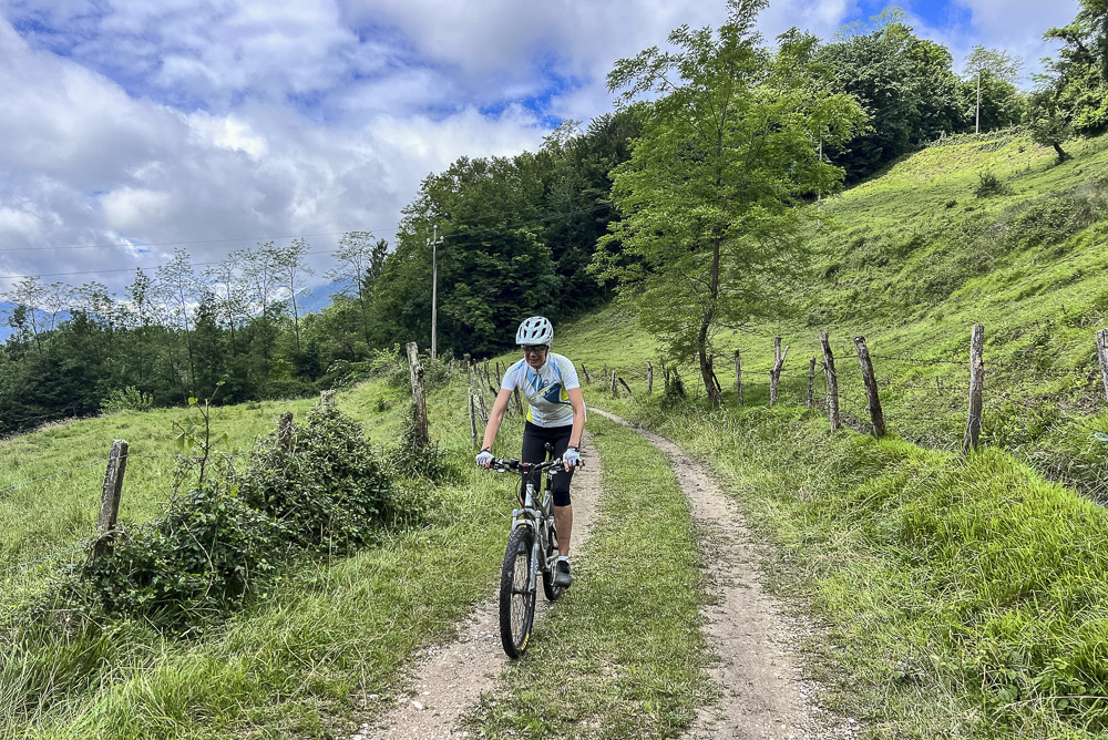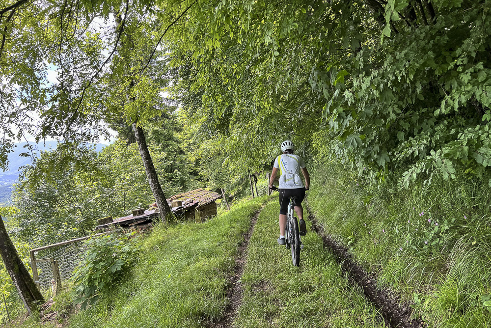 Die erste Tour hatte uns Lust auf mehr gemacht! In den Aktivkarten, die wir tags zuvor im Besucherzentrum mitgenommen hatten, waren einige MTB-Touren angeführt. Eine davon war die durch das Val di Lamen. Der Startpunkt und Parkplatz war diesmal in Pedavena bei der Kirche. Das Val di Lamen verläuft im Grunde parallel zum Val Canzoi. Wie tags zuvor führte eine asphaltierte Straße ins Tal hinein, nach einigen Kilometern zweigte unser Track in einer Ortschaft steil bergauf in einen Wald.