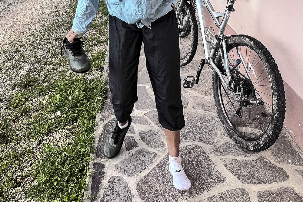 In zahlreichen Serpentinen ging es all die Höhenmeter wieder am Asphalt bergab (umgekehrte Fahrtrichtung wäre wirklich besser!). Der Regen peitschte uns ins Gesicht, die Brille war voller Tropfen. Die Ironie dabei: als wir wieder in Pedavena bei unserem Auto ankamen, schien die Sonne in voller Pracht vom Himmel und mehr noch: es hatte in Pedavena nicht einmal geregnet. Die Passanten sahen uns – völlig verdreckt und nass – ungläubig mit großen Augen an. Es muss ausgesehen haben, als hätten wir uns absichtlich in einem Schlammtümpel gesuhlt.