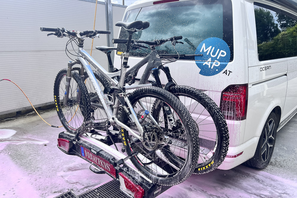 Diese setzte sich sodann in Bewegung und zwar schnurstracks zur nächsten Tankstelle mit Waschanlage. Gewaschen wurde allerdings nicht das Auto, sondern die Bikes hinten auf unserem Fahrradträger*.
