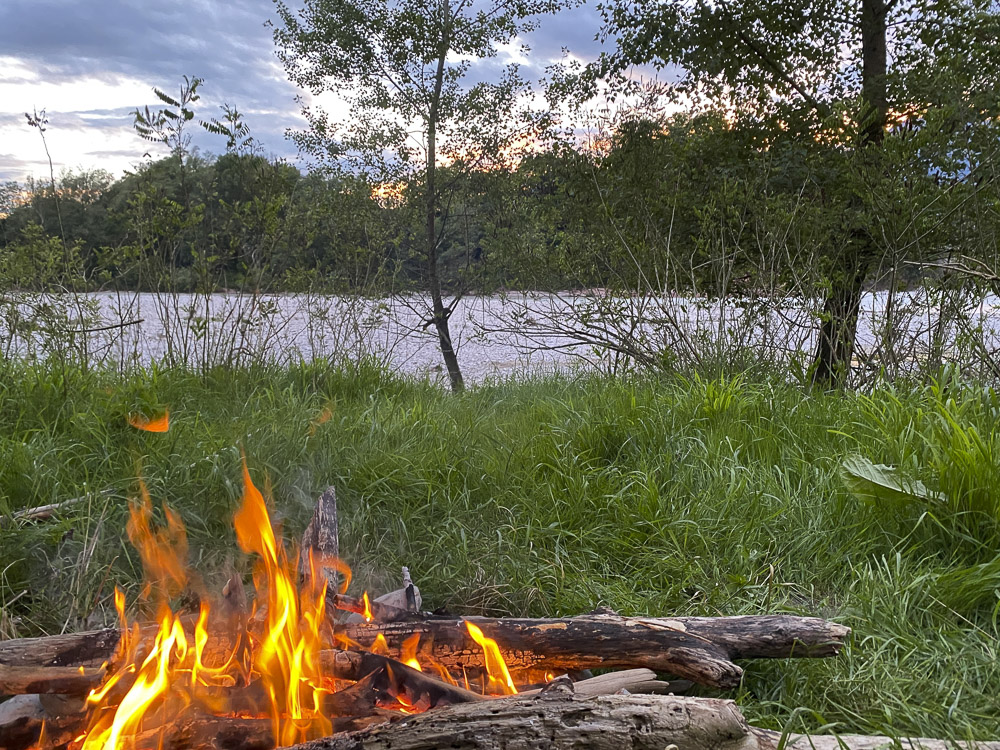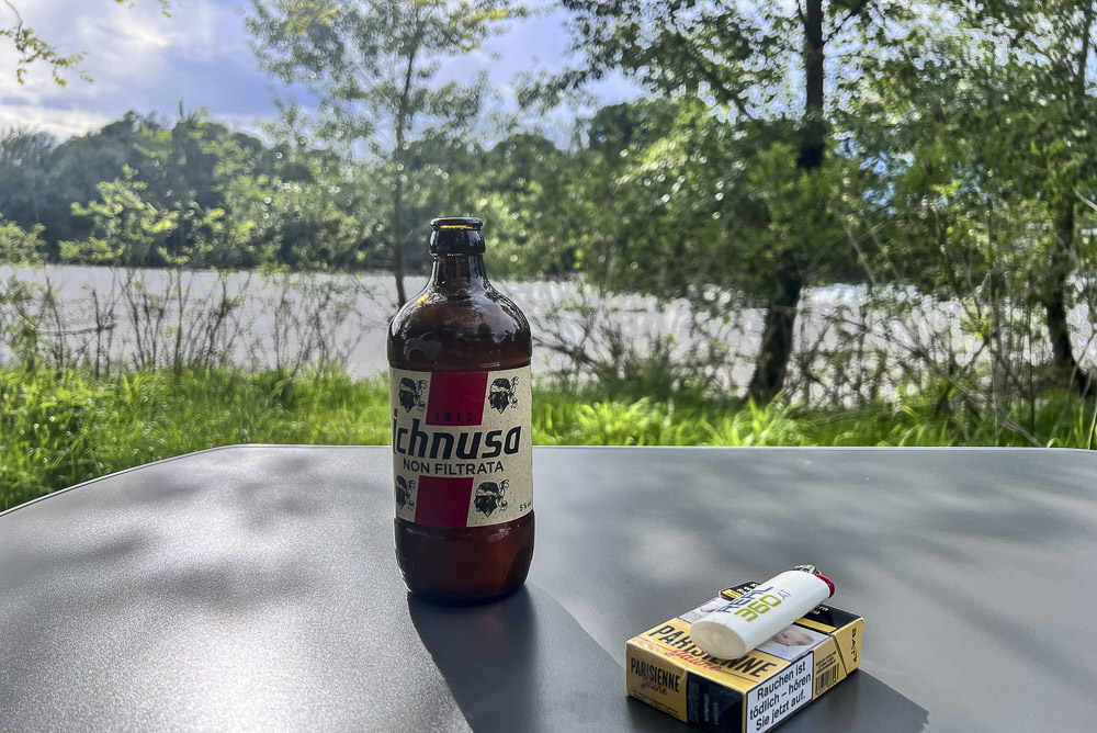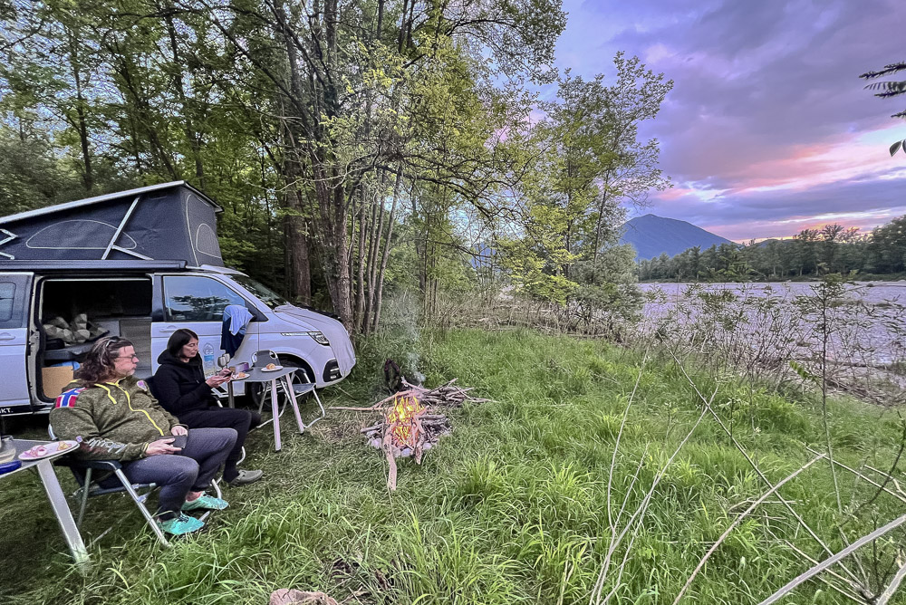 Wir fanden, dass wir uns nun wirklich ein riesengroßes Eis verdient hatten. Diese Belohnung schnappten wir in Feltre am Fuße der Altstadt in einer Gelateria. Danach kauften wir in einem Supermarkt noch eine ausreichende Menge an Octopussen zum Schnäppchenpreis und kehrten zu unserem „Stellplatz“ am Wehr von Busche zurück und gönnten uns eine Erfrischung in der Abendsonne. Als Axel schließlich ebenfalls von seiner Rennradtour zurückkehrte, war der Skotti-Grill* schnell ausgepackt: einem gepflegten Grillabend stand nichts mehr im Weg.